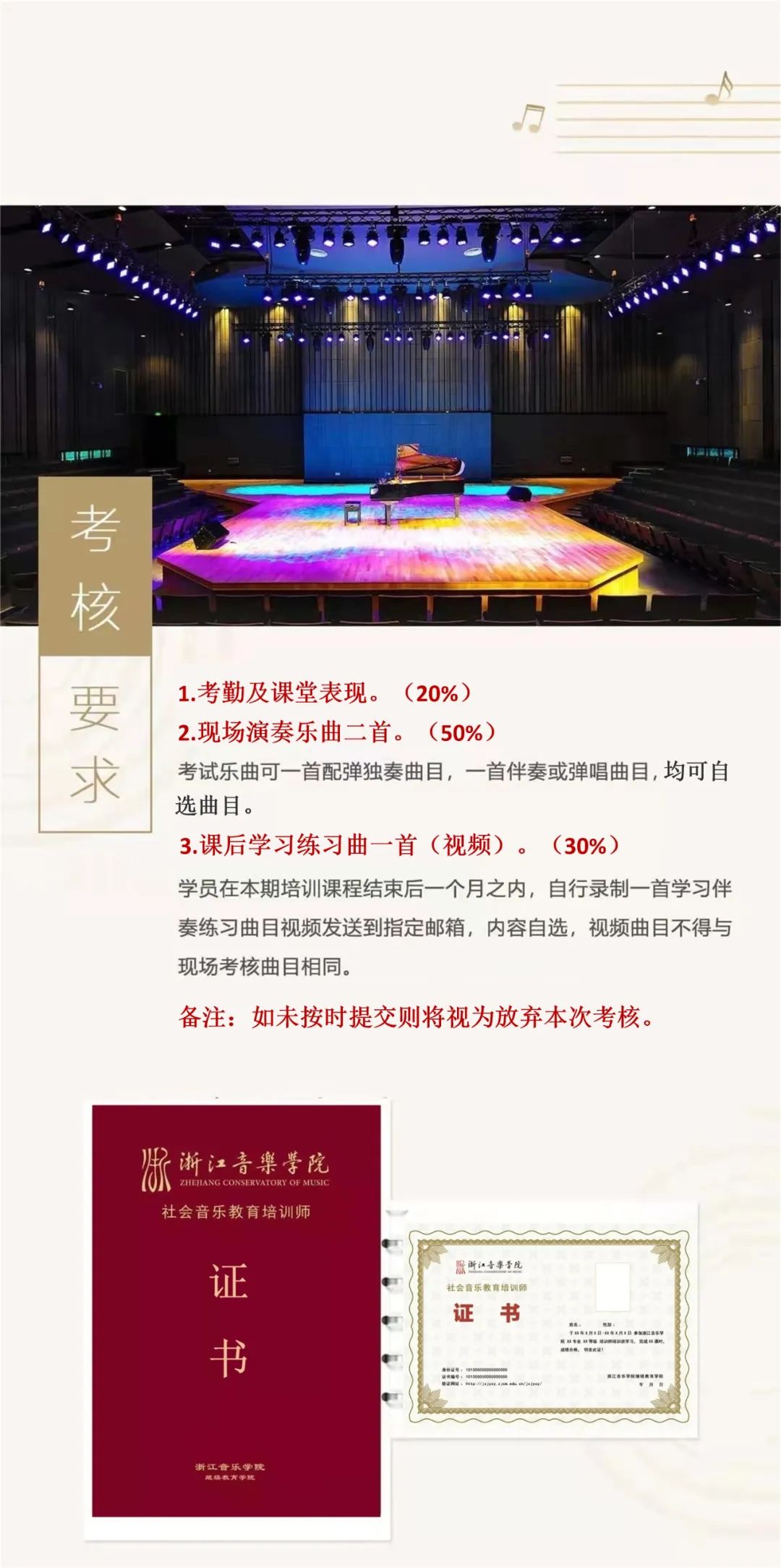 为推进社会流行音乐的专业化发展进程,强化社会音乐教育师资队伍和专业人才建设,提高社会音乐人才的整体水平和综合素养,浙江音乐学院根据培训实际需求,特制定“浙江音乐学院社会音乐教育培训师等级认证”标准,并开展相应等级的培训工作。通过考核者将获得由浙江音乐学院继续教育学院颁发的“浙江音乐学院社会音乐教育培训师证书”。