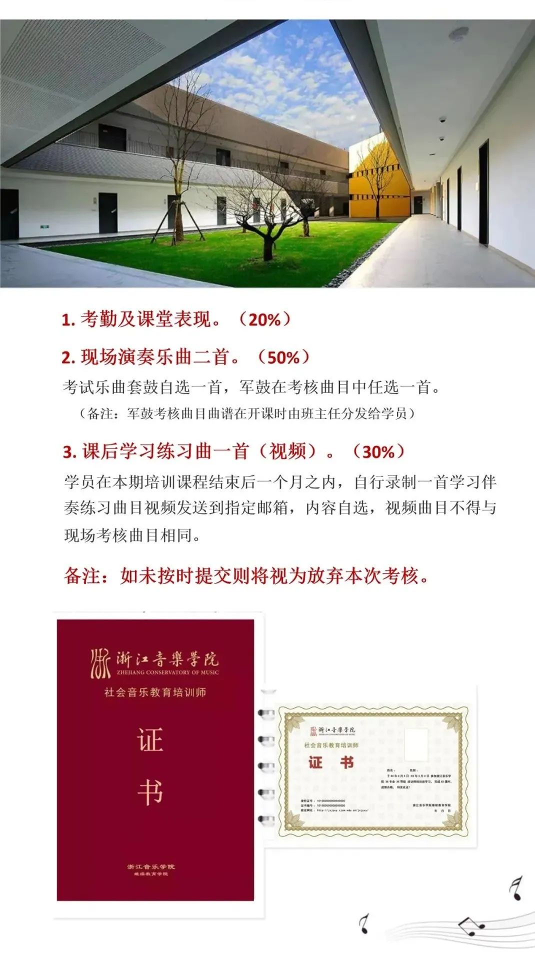 为推进社会流行音乐的专业化发展进程,强化社会音乐教育师资队伍和专业人才建设,提高社会音乐人才的整体水平和综合素养,浙江音乐学院根据培训实际需求,特制定“浙江音乐学院社会音乐教育培训师等级认证”标准,并开展相应等级的培训工作。通过考核者将获得由浙江音乐学院继续教育学院颁发的“浙江音乐学院社会音乐教育培训师证书”。