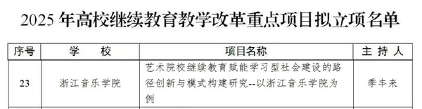 2026年3月30日,2025年浙江省高校继续教育教学改革重点项目拟立项名单正式公布,浙江音乐学院继续教育学院副院长季丰来主持申报的《艺术院校继续教育赋能学习型社会建设的路径创新与模式构建研究 —— 以浙江音乐学院为例》成功入选,充分彰显了学校在继续教育教学改革与艺术领域人才培养的深厚积淀和创新实力。