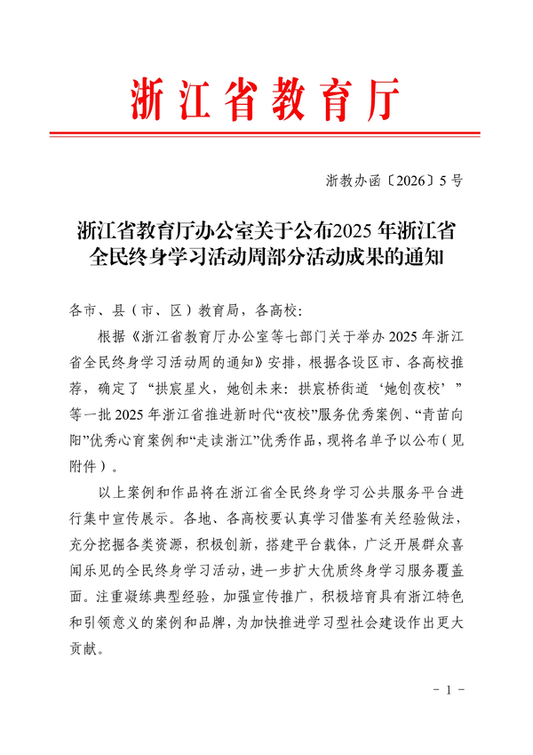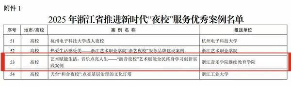 2026年1月下旬,《浙江省教育厅办公室关于公布 2025 年浙江省全民终身学习活动周部分活动成果的通知》正式公布,我院报送的《艺术赋能生活,音乐点亮人生 ——“浙音夜校” 艺术赋能全民终身学习创新实践案例》成功入选 2025 年浙江省推进新时代 “夜校” 服务优秀案例。“浙音夜校” 以 “艺术普惠、音乐惠民” 为核心理念,将专业音乐艺术资源转化为面向大众的普惠性学习服务,通过开设贴合市民需求的艺术课程,丰富群众精神文化生活,探索出一条艺术院校服务全民终身学习的特色路径,获得省级层面的充分肯定。